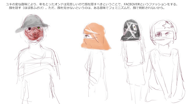 かぶりもの、なんですね、未来ってやつはw ガスマスク、戦闘機用ヘルメット、プライバシー。ともかく顔を出して歩けない時代なので、みんなかぶりものばかり。HMDのデザインは非常にむずい、どうもダサくなりがちですが、シングルアイのザクみたいな感じよりも、ゴーグルタイプのダブルディスプレイのほうが、デザインとしては良いと思います。フルフェイスは非常にダサイし、やりようがない。